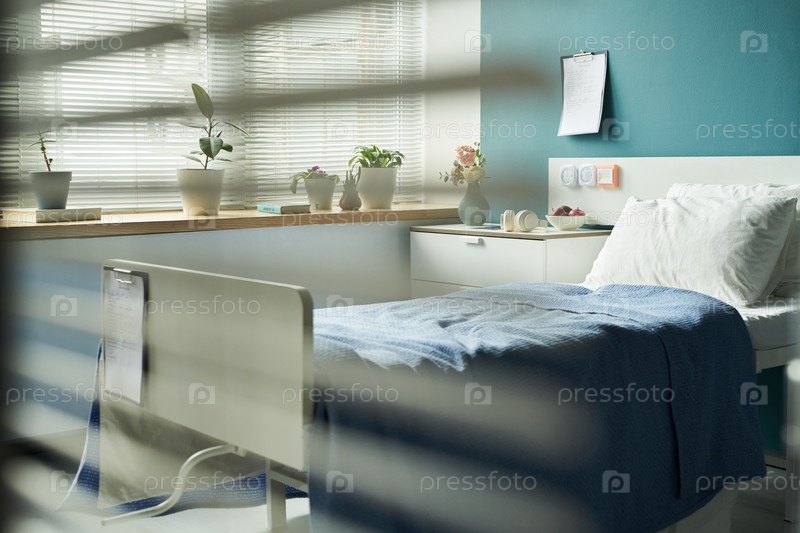Незанятая больничная кровать с голубым одеялом в комнате яркого медицинского выздоровления