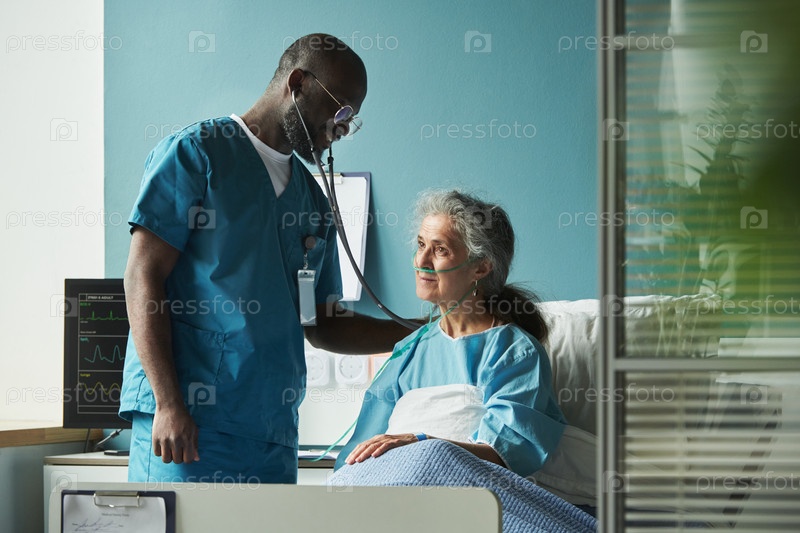 Чернокожий врач-мужчина осматривает старшую пациентку с помощью стетоскопа