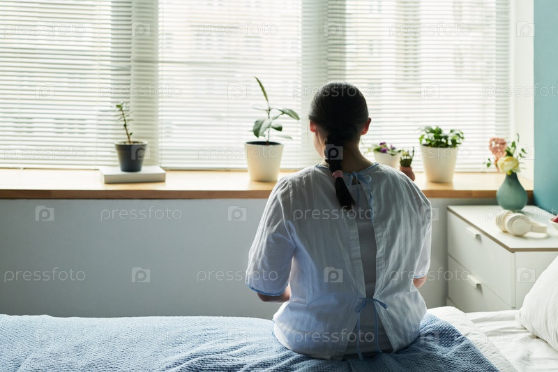 Молодая женщина сидит на кровати, смотрит в окно и размышляет