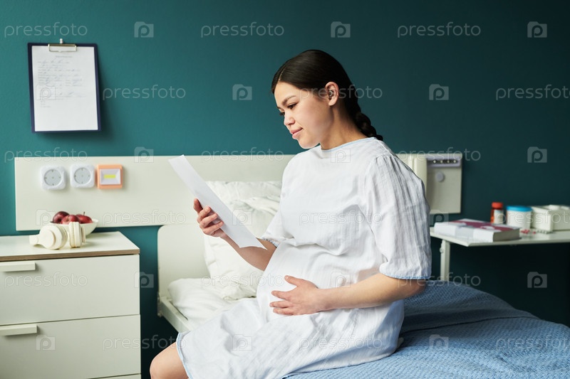 Беременная женщина сидит на больничной койке, читая медицинский документ