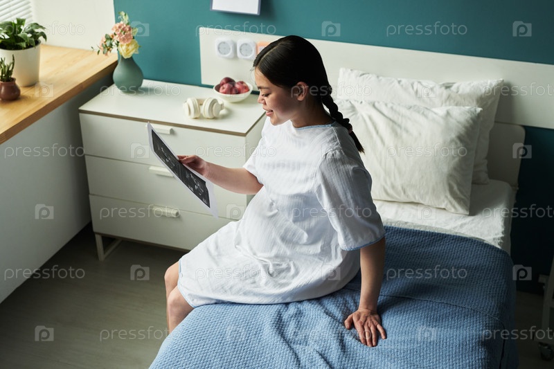 Беременная молодая взрослая женщина сидит на больничной койке, осматривая УЗИ