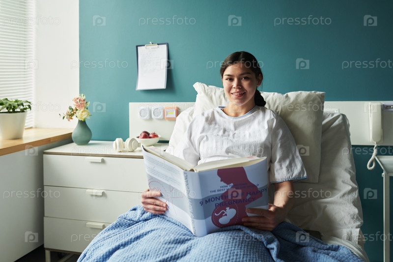 Портрет молодой женщины, улыбающейся во время чтения книги о беременности