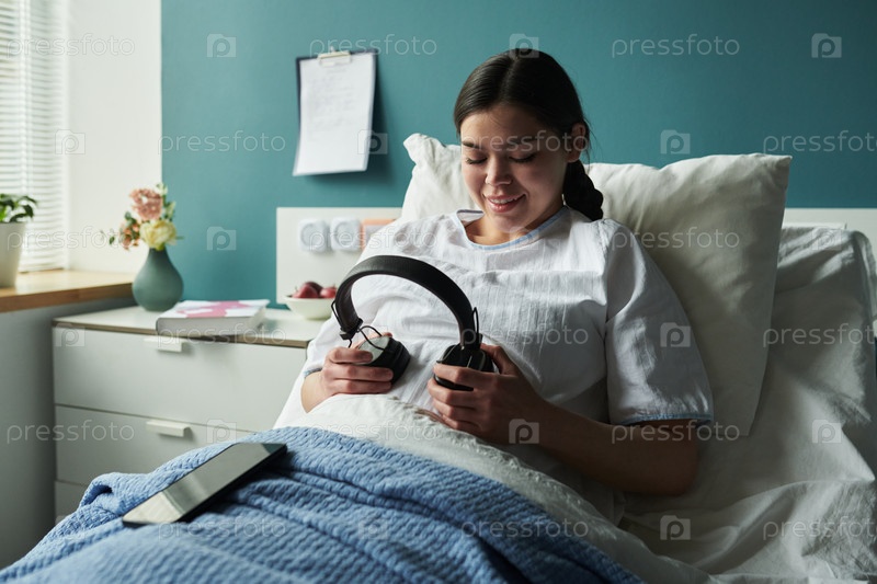 Беременная женщина отдыхает в больничной постели, слушая музыку с наушниками