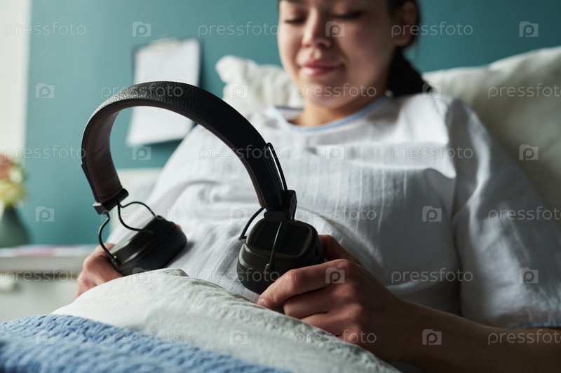 Молодая женщина кладет наушники на беременный живот, отдыхая