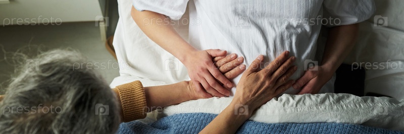 Женщина, касающаяся живота беременной дочери в больничной постели