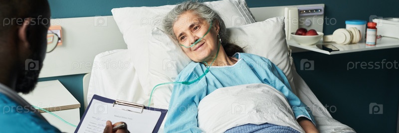 Старшая женщина, лежащая в больничной постели, улыбается чернокожему мужчине-попечителю
