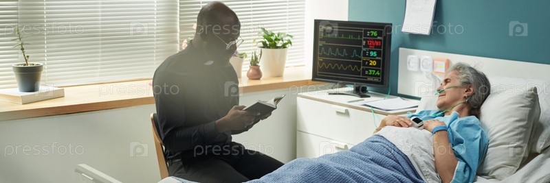 Черный мужской капеллан читает Библию пожилой женщине в постели хосписа