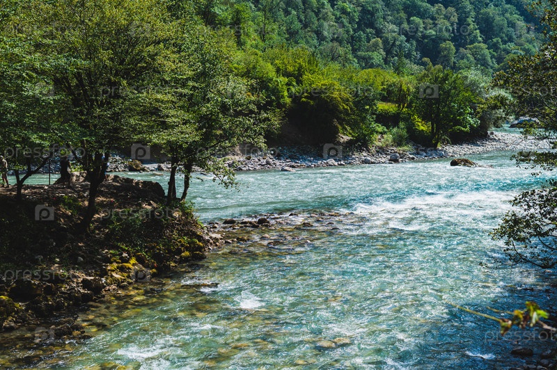 Свободная голубая горная река среди лесистых гор в солнечный день