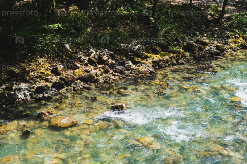 Скалистый, волосатый берег быстрой горной реки в солнечный летний день