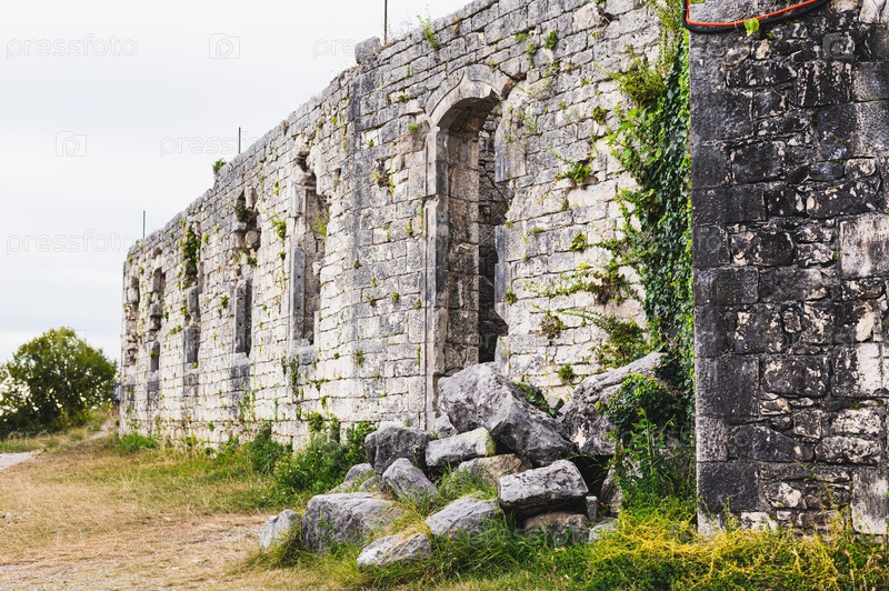 Древняя каменная разрушенная крепость с окнами, входом и грудой камней