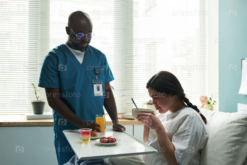 Чернокожий мужчина среднего возраста медсестра помогает беременной женщине есть пищу