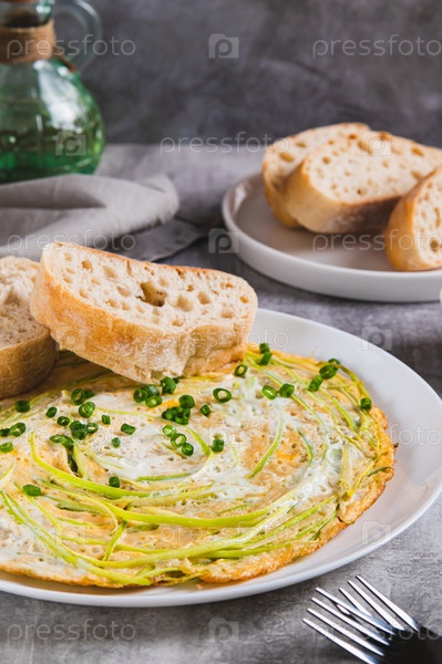 Жареные яйца с лапшой из цуккини и киабатой на тарелке на столе вертикальный вид
