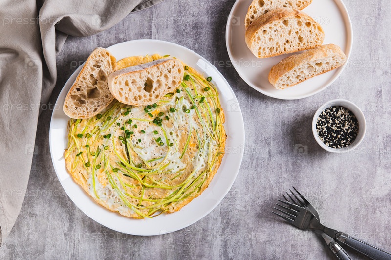 Жареные яйца с лапшой из цуккини и киабатой на тарелке с видом на верхнюю часть стола