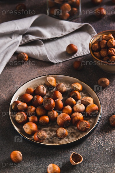 Питательные неочищенные лезовые орехи на тарелке и очищены в миске вертикального вида