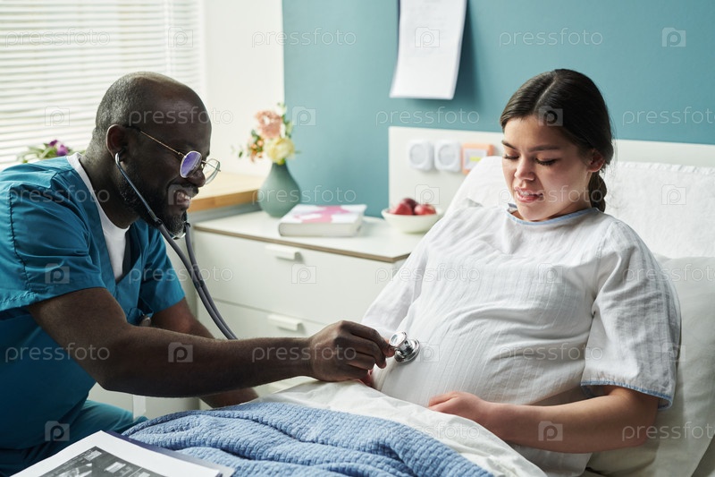Чернокожий мужчина среднего возраста Доктор осматривает беременную молодую женщину