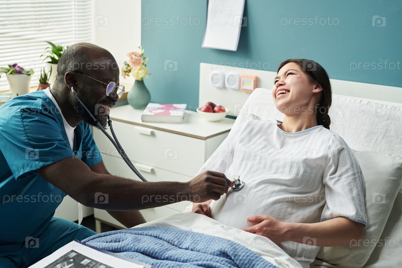 Беременная женщина смеется, пока чернокожий врач-мужчина проверяет живот с помощью стетоскопа