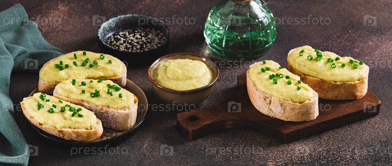 Сэндвичи с кабатой и луком, разбросанные по киабате на доске на веб-баннерном столе