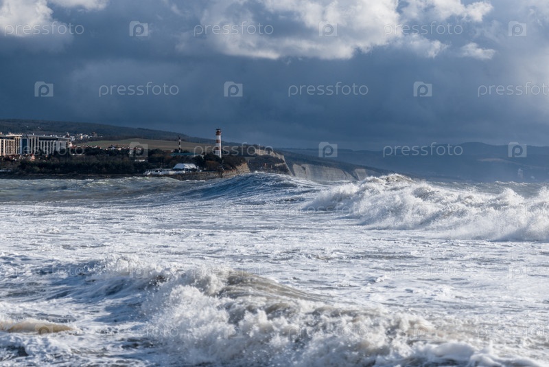 Геленджикский маяк стоит на высоком скалистом берегу. Сильный шторм в Черном море. Большие волны качаются по высокому берегу. Солнце светит сквозь облака