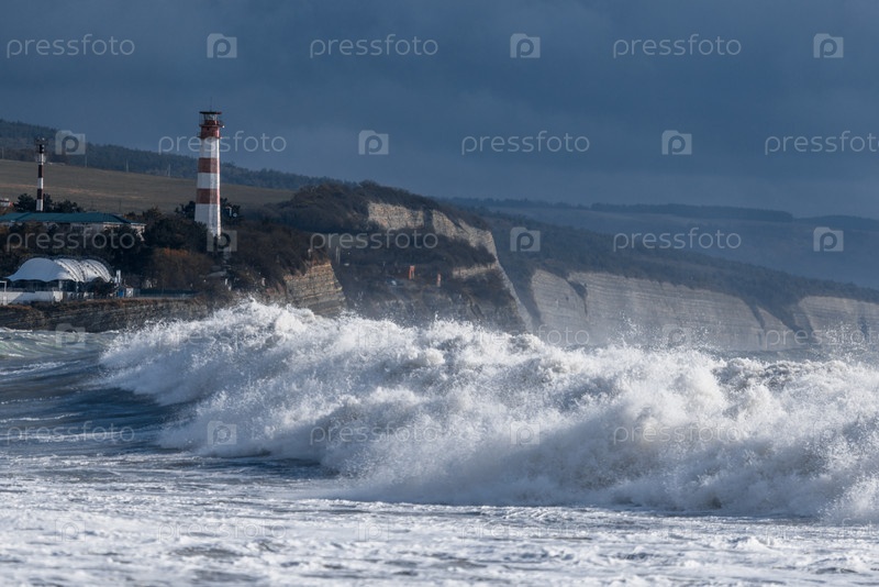 Геленджикский маяк стоит на высоком скалистом берегу. Сильный шторм в Черном море. Большие волны качаются по высокому берегу. Солнце светит сквозь облака