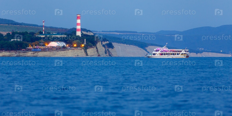 Геленджикский маяк на закате.Маяк стоит на высоком скалистом берегу. парусный корабль