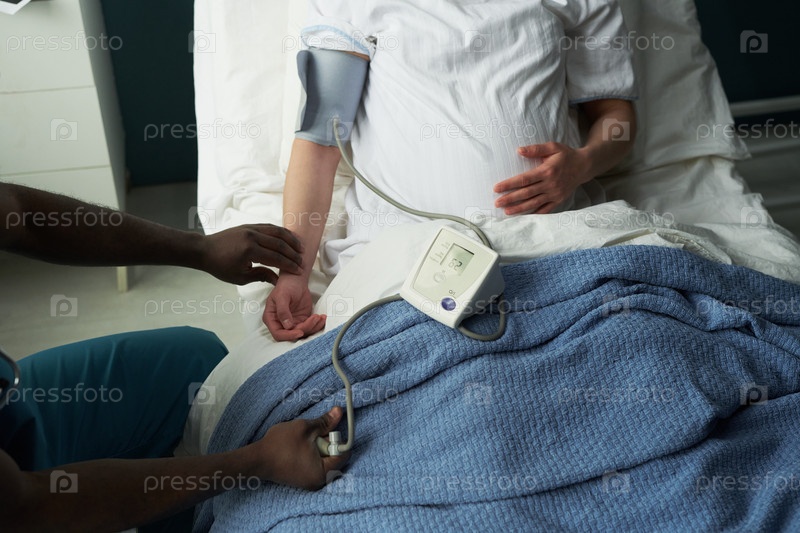 Беременная женщина, лежащая в больничной постели с проверкой кровяного давления