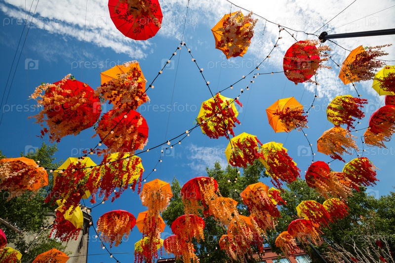 Яркие многоцветные зонтики и цветы на фоне голубого неба