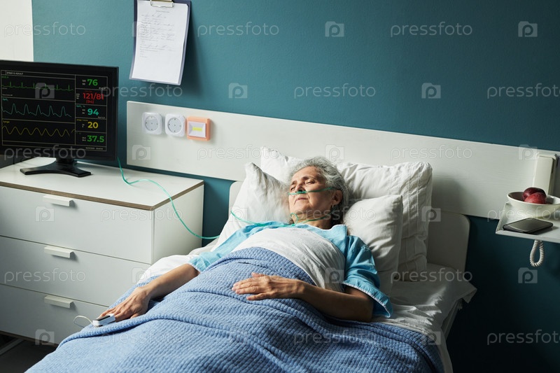 Пожилая женщина лежит в больничной постели, получая кислородную терапию