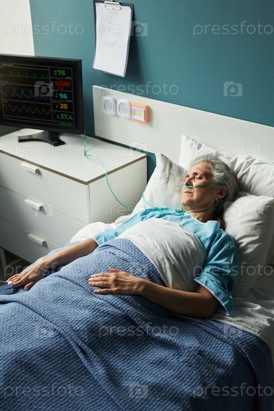 Пожилая женщина лежит в больничной постели под медицинским наблюдением