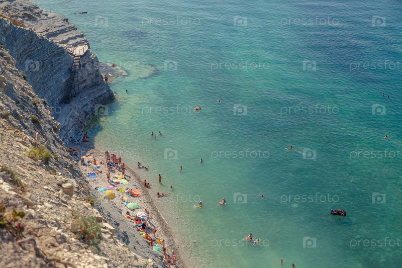 Геленджик. Пляж Сосновка. Высокая белая скала и пляж у основания обрыва. Чистое теплое море. Люди будут загорать на пляже
