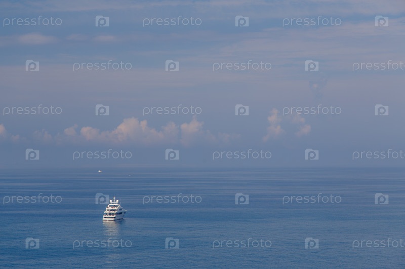 Большая белая яхта на гладких водах Черного моря. Гележик Курорт. Спокойствие. Яркие белые облака