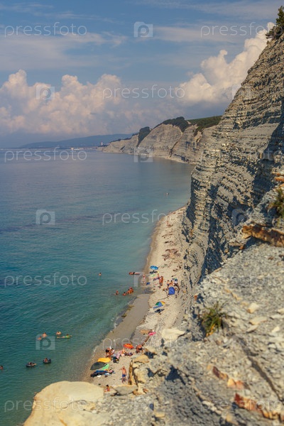 Курорт Геленджик, пляж Сосновка. Черное море. Высокие белые скалы, сосны растущие сверху. Пляж у основания обрыва. Маяк на заднем плане