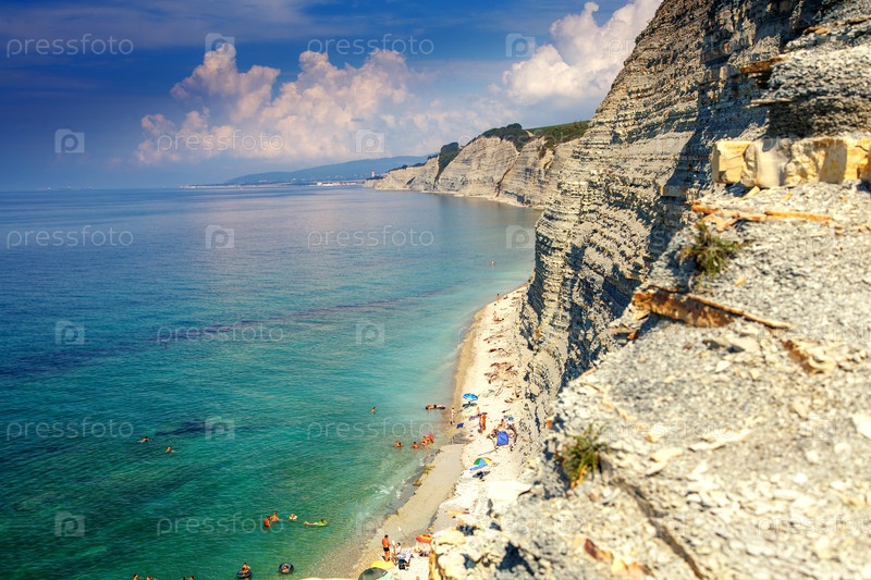 Курорт Геленджик, пляж Сосновка. Черное море. Высокие белые скалы, сосны растущие сверху. Пляж у основания обрыва. Маяк на заднем плане
