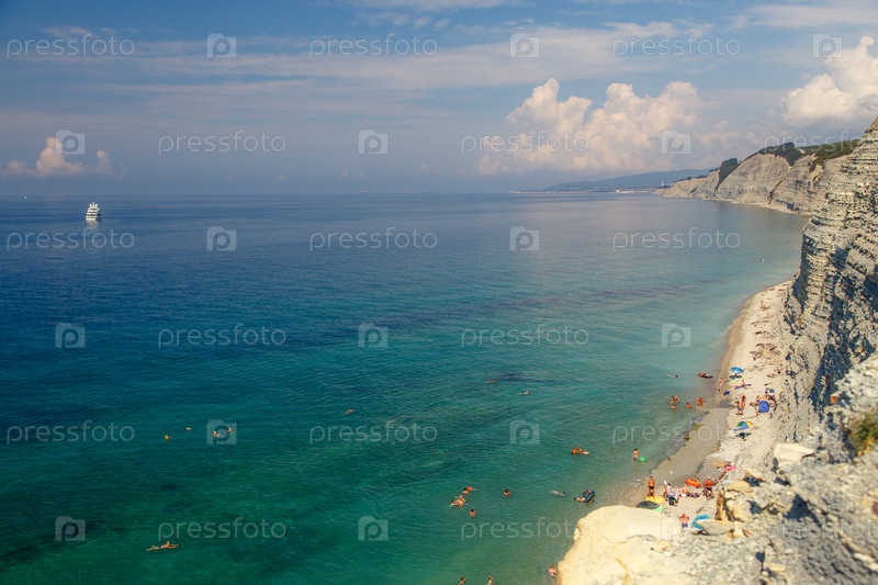 Курорт Геленджик, пляж Сосновка. Черное море. Высокие белые скалы, сосны растущие сверху. Пляж у основания обрыва. Маяк на заднем плане