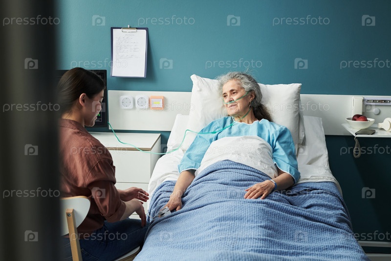 Пожилая женщина, лежащая в больничной постели и получающая поддержку от внучки