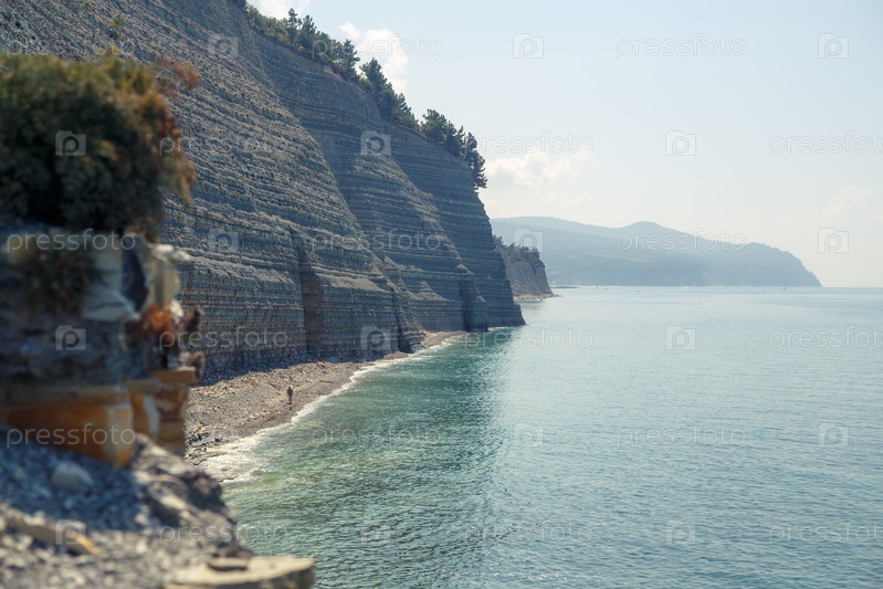 Курот Геленджик. Пляж Сосновка. Высокая белая скала и пляж у основания обрыва. Чистое теплое море. Люди будут загорать на пляже