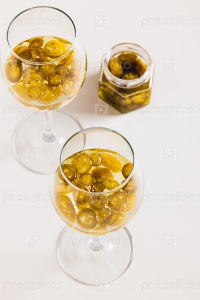 Зеленые кусочки перца халапено в белом вине в бокалах на столе с вертикальным видом