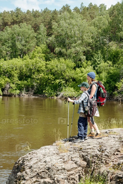 Мать и сын вместе ходят пешком возле реки в лесистом ландшафте