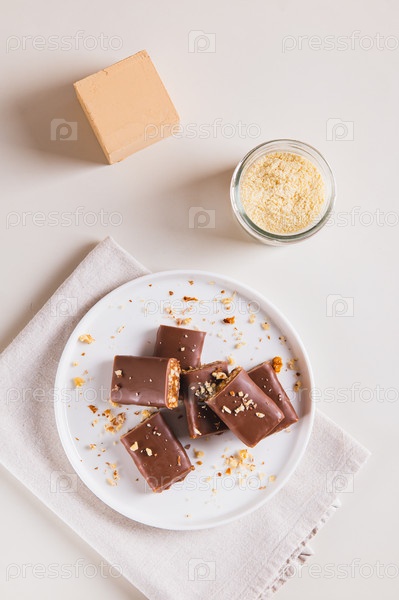 Шоколадный протеиновый батончик на тарелке на столе и вертикальный вид