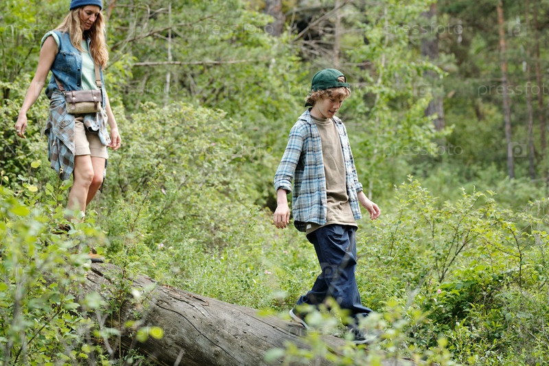 Мальчик-подросток балансирует на упавшем дереве, в то время как женщина ходит по окрестностям