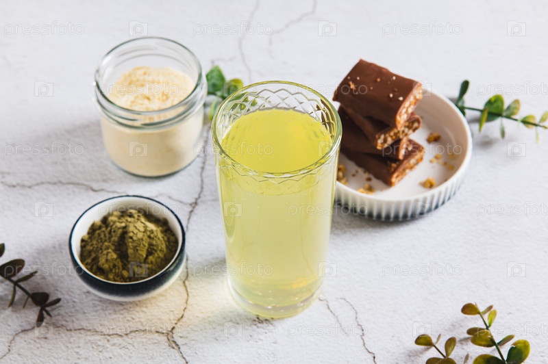 Сопоставьте чай с протеиновым порошком в стакане и батончиками на столе