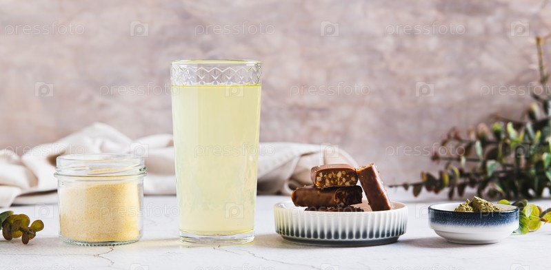 Сопоставьте белковый напиток в стекле, порошке и протеиновых барах с веб-баннером таблицы