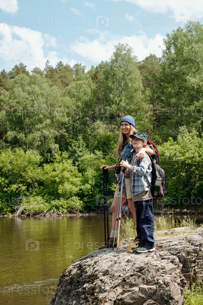 Мать и ребенок вместе ходят пешком возле реки в лесном ландшафте
