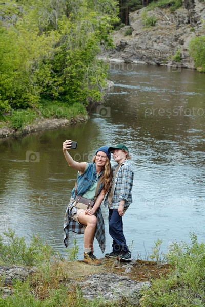 Семья снимает селфи вместе на открытом воздухе возле реки