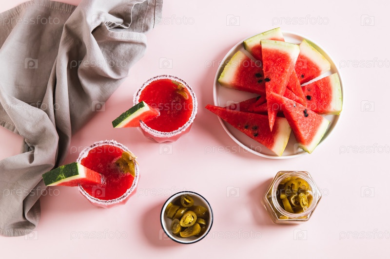 Горячий коктейль с арбузом, джалапено в бокалах с видом на стол