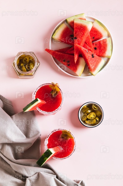 Арбуз джалапено алкогольная маргарита в стаканах на столе сверху и с вертикальным видом