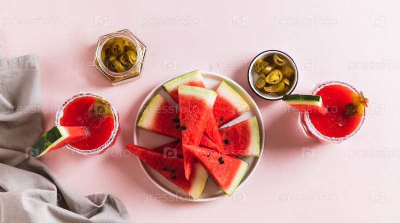 Арбуз джалапено алкогольная маргарита в бокалах с видом на стол
