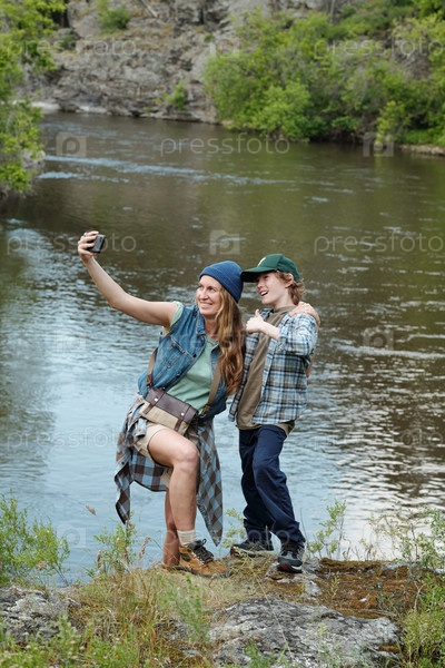 Женщина и мальчик вместе делают селфи River Outdoors