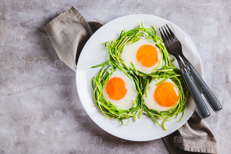Закройте уютные гнезда лапши из цуккини с жаренными яйцами на тарелке в видении сверху стола