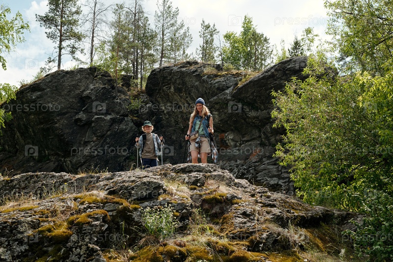 Мать и сын вместе ходят по скалистой тропе в лесу