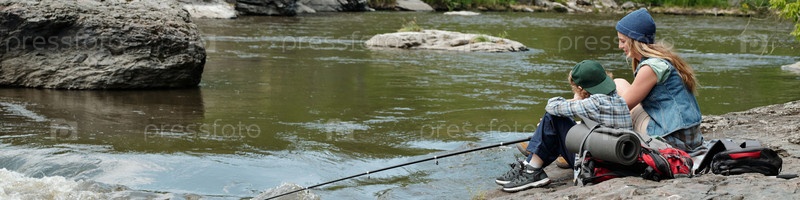 Мать и сын вместе ловят рыбу, сидя на берегу реки